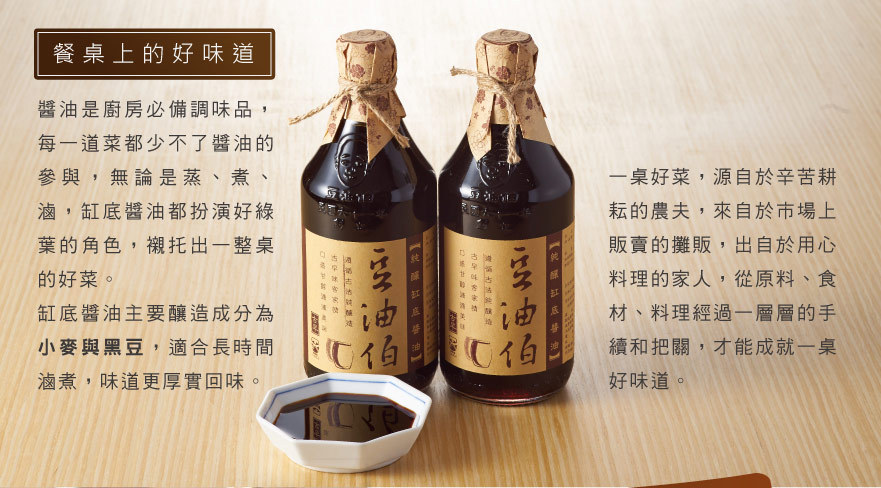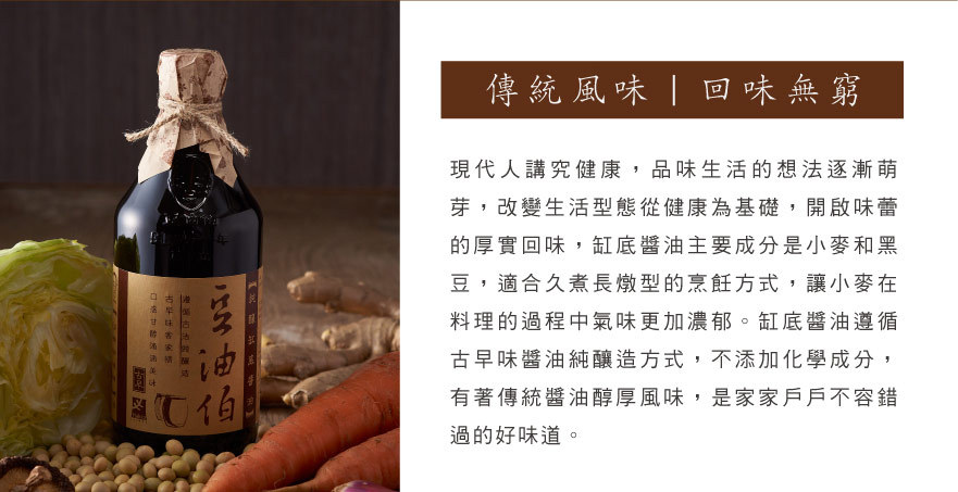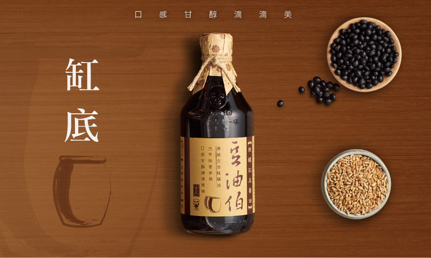 缸底醬油,主要釀造成分為「小麥」與「黑豆」,適合長時間滷煮,味道更厚實回味。