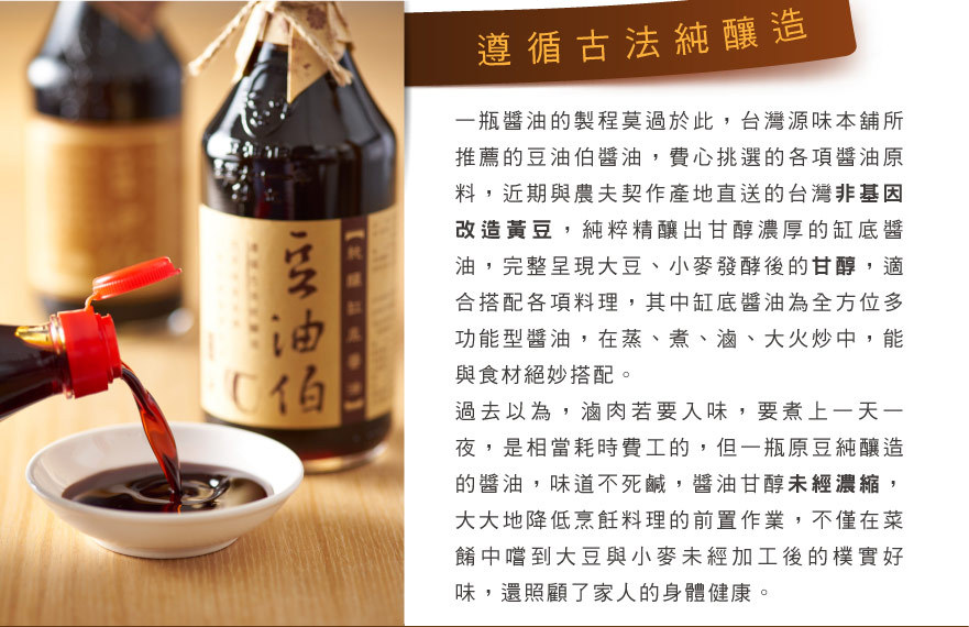 過去以為,滷肉若要入味,要煮上一天一夜,是相當耗時費工的,但一瓶原豆純釀造的醬油,味道不死鹹,醬油甘醇未經稀釋,大大地降低烹飪料理的前置作業,不僅在菜餚中,能夠嚐到「黑豆」與「小麥」未經加工後的樸實好味,還照顧了家人的身體健康。