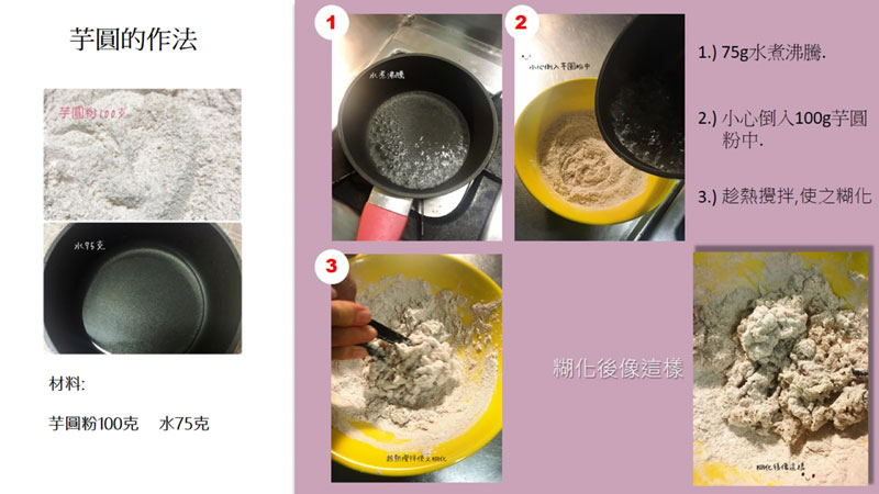 材料:芋圓粉100g, 沸騰的水55~75cc ,砂糖兩大匙