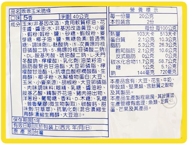 ▶️成分:玉米、非氫化精製油、花生醬、蝦米、醬油、砂糖、調味料、鹽、黑胡椒、碳酸鈣、維生素A、D3、B1、B2、維生素E(抗氧化劑)。