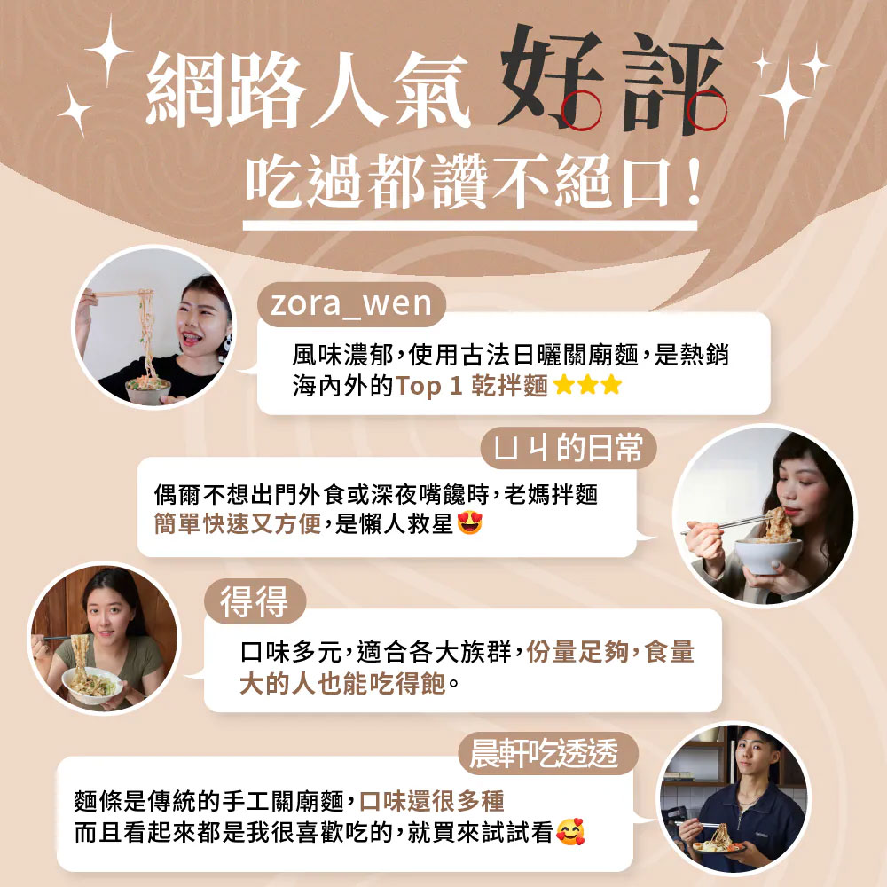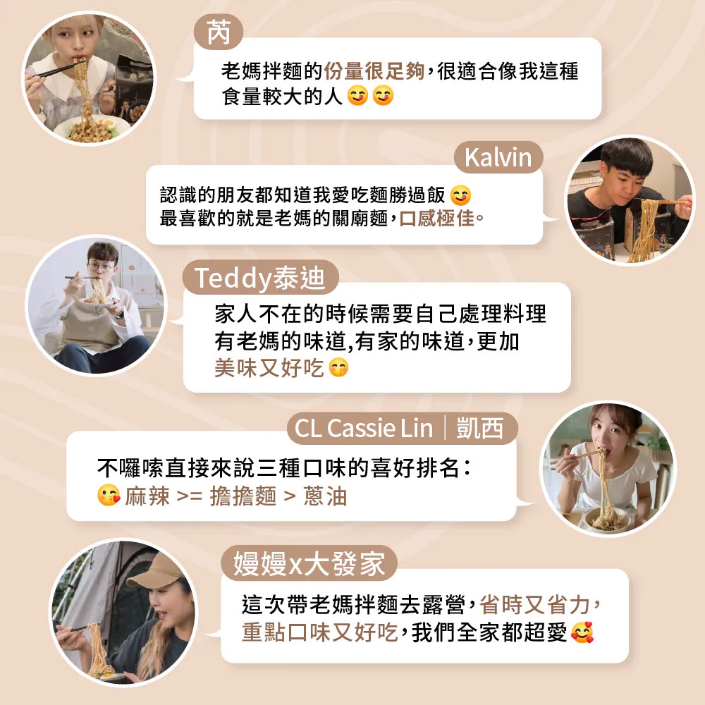 「老媽拌麵」秉持回歸食材原味精神,每項產品採用天然食材製造,堅持不添加人工香料,為支持本土農產品,使用在地好食材不斷研發獨創口味,以做出「食物級食品」為品牌的核心價值,日曬關廟麵Q彈快熟不軟爛的特性,搭配精製醬包,只要4分鐘就能享受即食的美味,透過網路無國界傳播目前全球已開發多個販售通路,以讓華人市場都吃得到道地中華美食為願景,讓一碗簡單的拌麵,吃出美味、吃的健康,吃得到家鄉的味道。