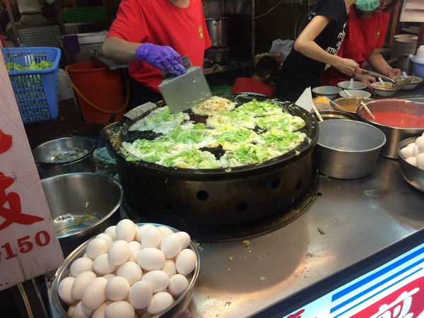 ▼台灣夜市的蚵仔煎攤位, 老板正忙著準備可口好吃的蚵仔煎