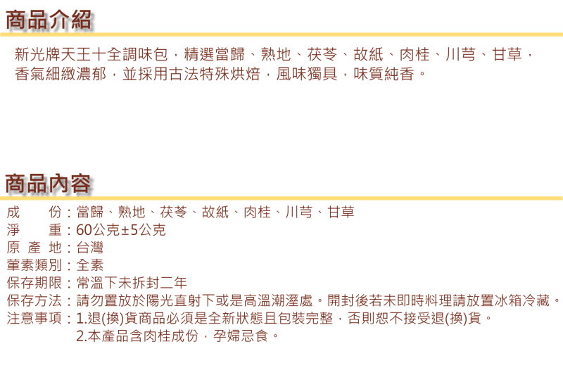 使用方法:將肉品洗淨後加入滾水予以汆燙取出備用。天王十全燉補包沖洗後,加入二公升水以大火煮滾後,轉小火燉煮約半小時至40分鐘後,再將川燙後的肉煮至熟透(約20分鐘)後,加入鹽,些許米酒即可享用。