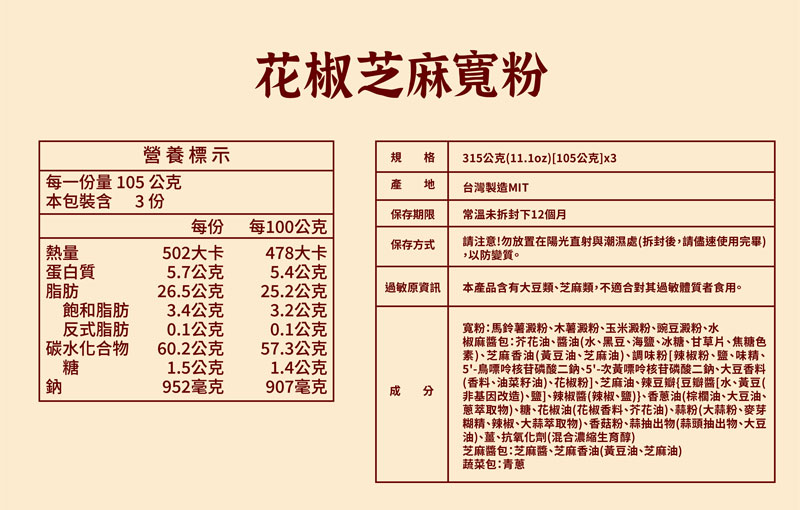 LD01 龍鼎 鹹豬肉佐料粉 140g ★絲絲入味,鹹香下飯★ 【使用方式】 ➡️ 取3kg的五花肉,肩胛肉,或後腿肉切成厚度 1.5cm 的肉片 ➡️ 肉片兩面均勻抹上本調味佐料粉 ➡️ 酌量添加蒜頭150g ➡️ 懷著愉快心情幫肉肉抓龍按摩5分鐘,放入冰箱冷藏三天 ➡️ 冷藏時小心..7.50€未稅:6.88€LD02 龍鼎 肉排調味品 210g ★香酥Q彈,鮮嫩多汁,超級好吃★ 【使用方式】 ➡️ 取3kg的里肌肉或後腿肉切成0.5CM厚片 ➡️ 取三碗水,第一碗水和本調味品拌勻倒入肉排 ➡️ 懷著愉快心情攪拌攪拌,湯汁收乾再加入第二碗水 ➡️ 來點音樂攪拌攪拌到湯汁收乾再加入第三碗水 ➡..6.21€未稅:5.80€LD03 龍鼎 鹹酥雞調味品 175g ★鹹鹹酥酥,香香嫩嫩,好吃到爆★ 【食材準備】 ➡️ 本調味品 1包,雞胸肉 3kg,水 200 cc. 【使用方式】 ➡️ 雞胸肉去皮切成 2cm 塊狀,沖洗乾淨瀝乾。 ➡️ 水跟本調味品調勻倒入切塊雞肉,懷著愉快心情一起攪拌均勻。 ➡️ 約5..7.50€未稅:6.88€LD04 龍鼎 排骨酥調味品 200g ★金黃香酥,黯然消魂,好過癮啊★ 【食材準備】 ➡️ 本調味品 1包,排骨 3kg,水 200 cc,烏醋 50 cc,麻油 50 cc. 【使用方式】 ➡️ 排骨切小段約 2cm 長,沖洗乾淨瀝乾。 ➡️ 水跟本調味品調勻倒入排骨,懷著愉快心情一..6.54€未稅:6.00€LD05 Red Yeast Powder 150g LD05 龍鼎 紅糟調味品 150g ★紅裡透白,暗香浮動,百吃不厭★ 【食材準備】 ➡️ 本調味品 1包,五花肉或梅花肉 3kg,米酒 50 cc, 【使用方式】 ➡️ 五花肉或梅花肉切1.5公分厚大片。 ➡️ 本調味品均勻抹於豬..7.52€未稅:6.90€【仙知味】 蚵仔煎粉 ~非常道地的台灣小吃,自己在家中,亦能輕鬆的吃到 ~★ 廚房內的好幫手 ★ 輕鬆做出美味料理 ★ 蚵仔煎在家做,方便快速又有成就感 容量: 500g 成份: 樹薯粉、醋酸澱粉。 產地: ..3.80€未稅:3.49€SA03 Pudding powder brown sugar flavor 300g SA03 仙知味 黑糖粉粿粉 300g ⭐非常道地的台灣小吃,自己在家中,亦能輕鬆的吃到。 ⭐精緻調理, 品味生活。 ⭐料理DIY, 方便又衛生。 ⭐廚房內的好幫手。 ✅輕鬆做出美味粉粿只需幾分鐘 ..3.21€未稅:3.00€【新光】 藥膳排骨 調理包 ~傳統台灣的溫補藥膳 ~ ★ 御用極品好料理 ★ 味香質純是上選 ★ 傳統美食來品嚐 ★ 溫暖情意滿心頭 ★ 台灣人重食補,每年一到秋冬,羊肉爐、薑母鴨、藥燉排骨等藥膳頓時活絡起來,其..4.30€未稅:3.95€SK02 新光 蒙古麻辣火鍋湯底 75g ~融合數十種藥膳與辛香料所調製而成;如孜然、茴香、大紅袍花椒、草果、白荳蔻、肉桂、甘草、川芎、當歸、白胡椒、辣椒、月桂葉。口感香醇不燥口,滋味豐美。 加入食材後,口感將轉而厚實香醇,湯頭美味迷人。新光牌麻辣火鍋湯底,口感傳香,極品推薦! ..5.79€未稅:5.41€SK03 新光 天王十全調味包 60g ~冬天溫補,夏天涼補,一年四季皆適用 , 傳統台灣的十全大補藥膳 ~ ★ 御用極品好料理 ★ 味香質純是上選 ★ 傳統美食來品嚐 ★ 溫暖情意滿心頭 ★ 台灣人重食補,每年一到秋冬,..4.30€未稅:3.95€SK04 新光 四神湯 90g ~四季食補, 暖胃鍋物~ ★ 御用極品好料理 ★ 味香質純是上選 ★ 傳統美食來品嚐 ★ 溫暖情意滿心頭 ★ 四神湯: 「四神湯」是民間傳統的藥膳,原稱「四臣湯」,是由四味中藥(芡實、蓮子、淮山、茯苓..5.78€未稅:5.30€SK07 新光 青草茶調味包 100g ▶️ 御用極品好味道,味香質純是上選,傳統美食來品嚐,消暑退火好清涼。 ▶️ 嚴選上等鳳尾草,黃花蜜菜,薄荷,仙草茶,珠仔草,採古法特殊烘焙高調製而成。 ▶️ 風味獨具,味香質純。 ▶️ 手作DIY 樂趣多更多。 ▶️ 製作簡易、快速又方便。 ..4.20€未稅:3.85€SK08 新光 仙草茶調味包 100g ▶️ 御用極品好味道,味香質純是上選,傳統美食來品嚐,消暑退火好清涼。 ▶️ 香醇濃郁,口感滑順。 ▶️ 手作DIY 樂趣多更多。 ▶️ 製作簡易、快速又方便。 ▶️ 動手自己做,安心又健康。 ★ 品牌故事: 新光洋菜 ★ ..4.20€未稅:3.85€