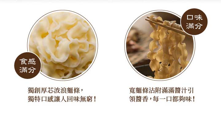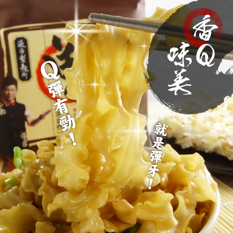 二、要彈:彈的口感取決於麵體,試過數十種麵!我發現關廟麵口感最好,但是稍嫌不夠Q彈。於是我們改良了關廟麵的波浪麵體後,讓他更耐煮、更彈牙。立體的波浪空間把醬香、椒麻香呈現得更有層次。不再像傳統乾麵糊在一起的感覺,這點很重要。
