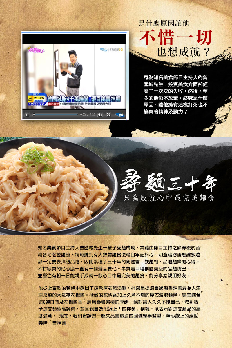 在台灣,曾國城等於「美食」的代名詞,他說這個東西好吃,沒人敢懷疑。主持過大小美食節目的他,嚐遍各國美食,獨獨衷愛「麵」,累積了30年聞麵香、觀麵相、品麵嚐的心得,更心心念念的是如何讓大家吃到值得期待的麵。於是,「曾拌麵」在他的堅持之下誕生了。