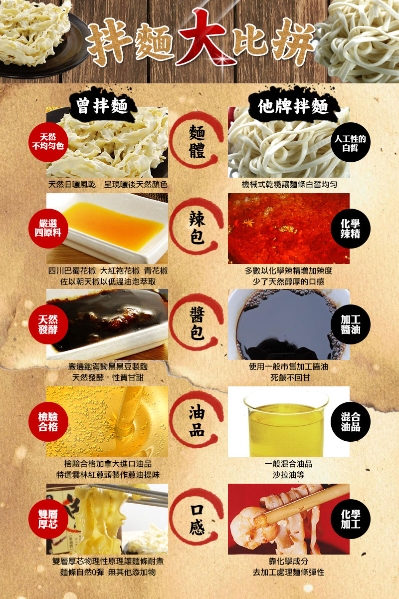 「曾拌麵」可謂他的心血之作與驕傲,逢人就問:「你吃過我的麵嗎?」他說,好吃的辣拌麵不能只有辣,必須要香、要彈、要麻、要辣、還要有回頭韻。因此曾拌麵改良關廟麵的波浪麵體,手工日曬,自然風乾,讓它更彈牙的同時,充分吸附醬汁。嚴選天然發酵