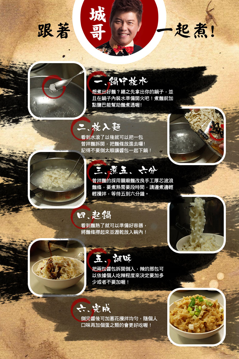 演藝圈裡大家眾所皆知曾國城愛麵成痴,30年來嚐遍大江南北麵食,如今身為一個美食節目主持人心中一直想要做一款符合自己期待的麵食推薦給大家,在這漫長的主持歲月裡,也吃過不少道地的麵食,終於在今天各方面時機都成熟情況下。城城親自監製挑選品嚐在各方面都符合自己心中期待的好麵。以過海製麵所出品正式推出"曾拌麵",來為這些年嚐過的優秀麵食做一個完美的總結。