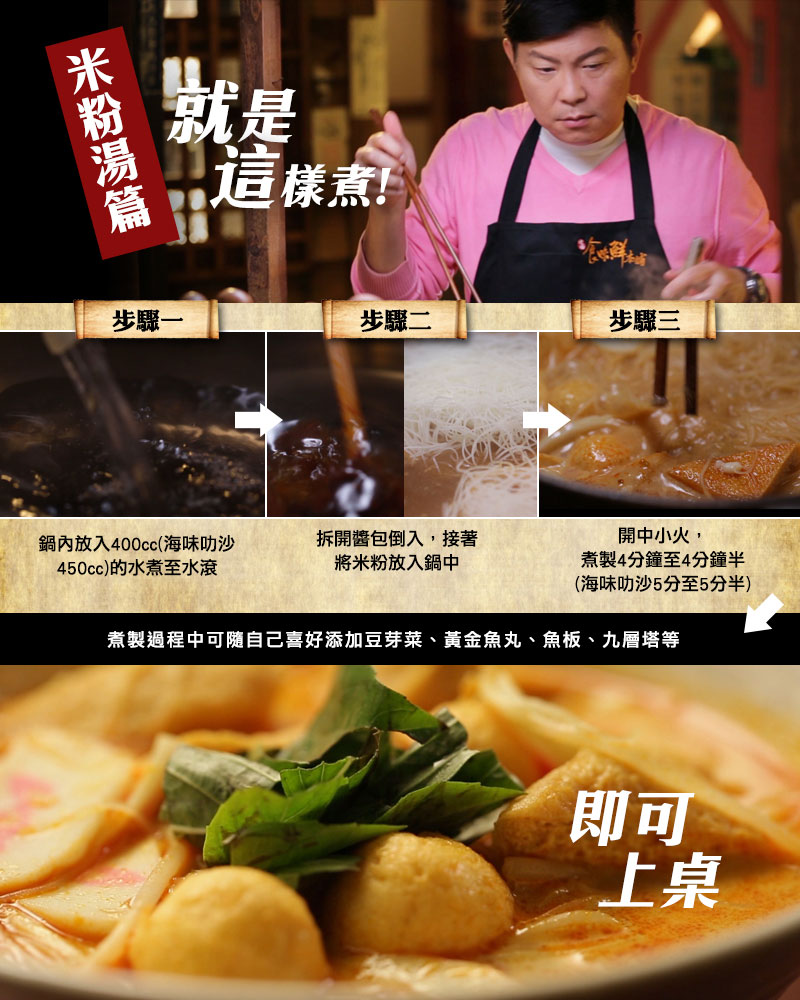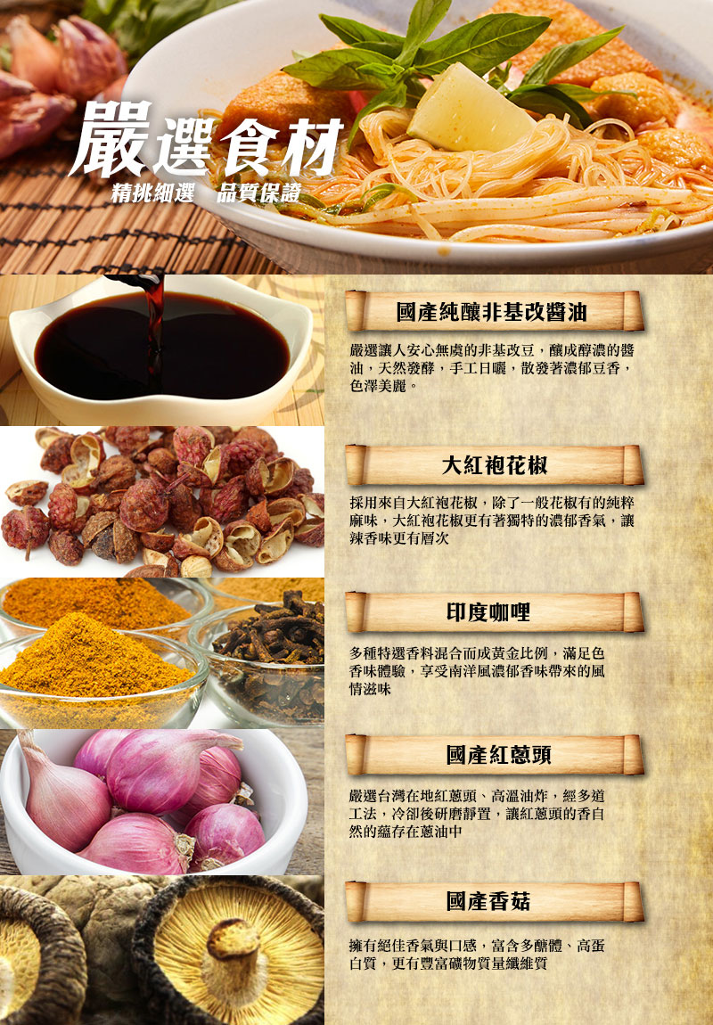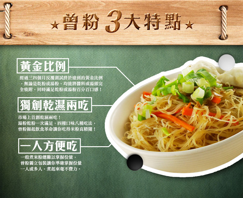 充滿南洋風情的叻沙融合咖哩與椰漿,來自大海的鮮香讓美味加倍,這碗異國風米粉絕對讓人驚艷。 按包裝上建議的水量與順序烹調,一包曾粉能完美詮釋乾湯兩種吃法,樂趣與變化加倍。