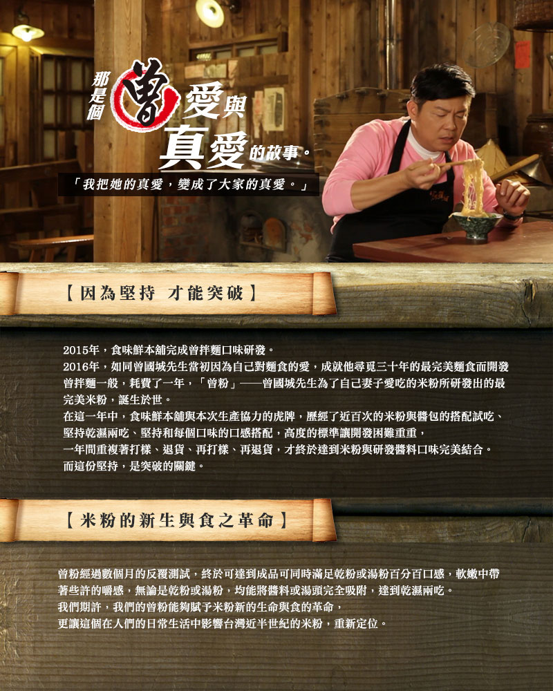 2016年,曾國城為了喜愛米粉的老婆,研發出「曾粉」,將他對老婆的真愛,變成了大家的真愛。曾粉歷經一年的研發,克服了乾濕兩吃完美比例的困難度,推出「紅蔥肉燥、麻辣肉燥、海味叻沙、素香菇肉燥」四種口味,重新定義傳統米粉所帶來的味覺感受。