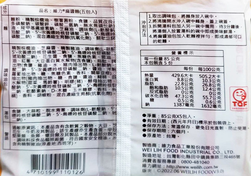 ▶️調味油包:精製棕櫚油、芝麻醬、花生醬、精製豬油、調味劑(L-麩酸鈉、5'-次黃嘌呤核苷磷酸二鈉、5'-鳥嘌呤核苷磷酸二鈉、琥珀酸二鈉)、食鹽、醬油、芝麻油、紅蔥、大豆蛋白質水解物(含食鹽)、烏醋、複方調味粉[蛋白質水解物(大豆)、L-麩酸鈉、食鹽、碳酸鉀、琥珀酸、檸檬酸、酵母抽出粉、5'-次黃嘌呤核苷磷酸二鈉、5'-鳥嘌呤核苷磷酸二鈉]、焦糖色素、豬肉抽出物[豬肉抽出物、糖、食鹽、醬油、糊精、蛋白質水解物(甜菜、馬鈴薯)、明膠(豬)、酵母抽出物、L-麩酸鈉、5'-次黃嘌呤核苷磷酸二鈉、5'-鳥嘌呤核苷磷酸二鈉、乾酪素鈉、D-木糖、玉米糖膠、香料、食用酒精]、胡椒粉、紅椒色素(辣椒抽出物、葵花油)、混合濃縮生育醇(抗氧化劑)、辣椒抽出物(辣椒、大豆油)。